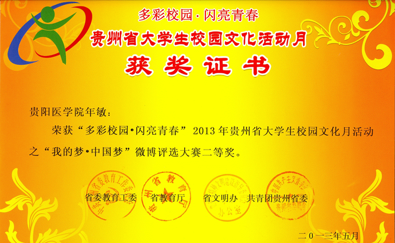 在“多彩校园,闪亮青春”--贵州省老员工校园文化月活动中,经过层层筛选,公司2011级预防医学专业年敏同学荣获“我的梦、中国梦”微博评选大赛二等奖。