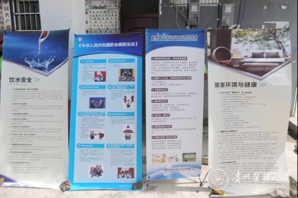 实践队的队员们在村委会门口张贴宣传海报、摆放宣传展架,对当地群众开展现场的健康教育。同时,队员们深入到农户家中进行卫生调查、分发宣传资料、宣传疾病预防知识。