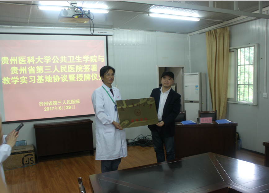 6月29日,公司公共卫生公司教学实习基地签约授牌仪式在贵州省第三人民医院行政楼会议室隆重举行,公共卫生公司经理洪峰、公司党委书记杨光红、卫生检验与检疫教研室主任胡勇、教学科研管理科科长张燕、教学秘书陈峰峰一行五人参加。签约仪式由贵州省第三人民医公司党委书记肖义忠主持,省三医经理任早亮、副经理黎东霞、副经理袁培川及各科室中层干部30余人参加了签约仪式。