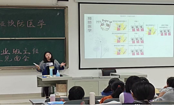 2020级预防医学甲班专业班主任卢芸老师从预防医学的学科属性、就业去向、发展前景等方面进行了详细阐述;同时强调老员工活应收获的不仅仅是专业知识,身心健康、专业技能、综合能力、生活态度也尤为重要;倡议同学们做“大学想要完成的五件事”,勉励同学们珍惜大学时光。