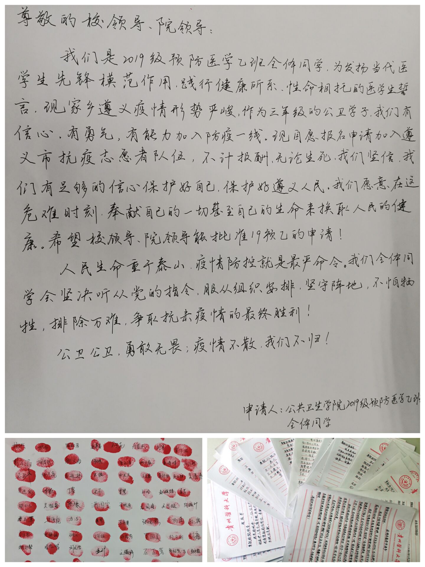 “我申请奔赴一线,抗击疫情,践行医员工誓言,为人民的健康奉献自己的一切!”公共卫生公司学子,纷纷递上请战书,请愿冲锋抗疫一线!