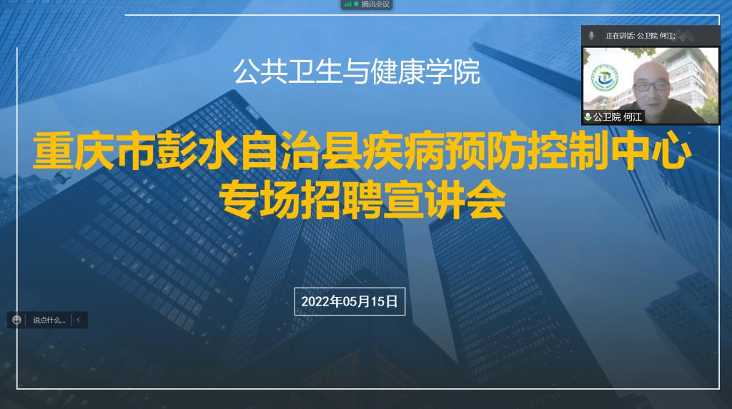 为切实做好2022届毕业生就业工作,积极构建毕业生与用人单位的交流平台,为用人单位精准输送专业人才。tyc33455cc太阳成集团于5月16日举办重庆市彭水自治县疾病预防控制中心线上专场招聘宣讲会。重庆市彭水县卫生健康委员会党委委员、副主任、县疾病预防控制中心主任石发䘵,县疾病预防控制中心支部书记、副主任张洪军,副主任任国茂,公共卫生与健康公司党委副书记何江、毕业班辅导员以及2022届预防医学专业、卫生检验与检疫专业毕业生参加会议。会议由毕业班辅导员李梦娟主持。