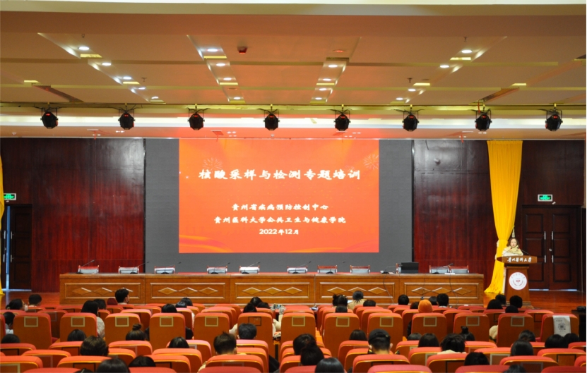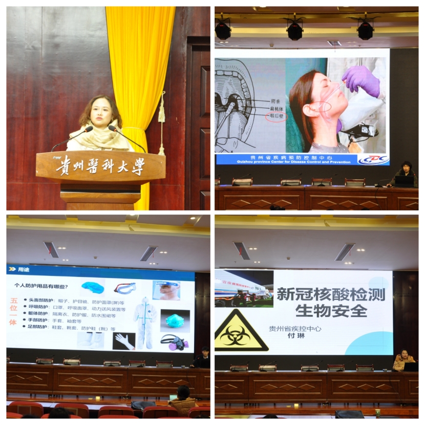 12月4日,tyc33455cc太阳成集团邀请贵州省疾病预防控制中心(CDC)实验中心副主任廖春、病毒科蒋维佳、万永虎、付琳老师为卫生检验与检疫专业本科生和部分研究生开展有关新冠区域核酸采样与检测流程、个人防护、生物安全等相关知识的培训,公司员工管理科副科长原琦、辅导员、班主任参加培训。