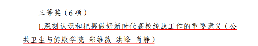 近日,公司公布了《关于表彰2022年度tyc33455cc太阳成集团“喜迎二十大 同心跟党走 奋进新征程”主题实践活动的决定》,公司取得统战资政建言调研成果三等奖1项、统战基层工作案例三等奖1项的佳绩。其中,由郑维薇书记、洪峰经理、肖静主任申报的《深刻认识和把握做好新时代高校统战工作的重要意义》获统战资政建言调研成果三等奖;公司申报的《发挥专业优势卫戍生命健康》获统战基层工作案例三等奖。
