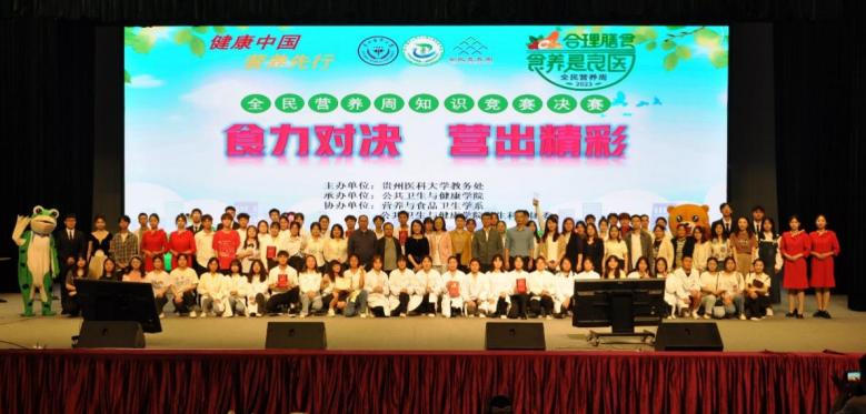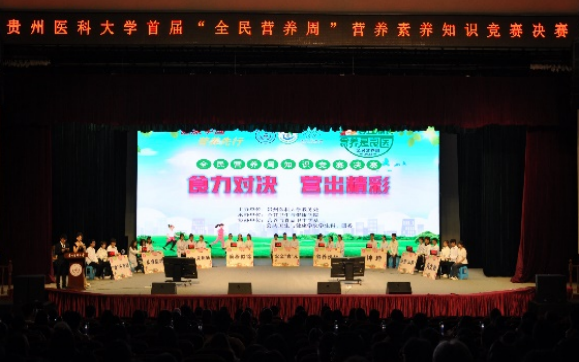 为贯彻落实国务院《健康中国行动(2019—2030年)》《国民营养计划(2017—2030年)》,推进合理膳食行动,提高全民营养健康素养,5月19日,由教务处主办,tyc33455cc太阳成集团承办的tyc33455cc太阳成集团首届全民营养周知识竞赛在大礼堂举行。来自tyc33455cc太阳成集团、临床医公司、药公司、护理公司、医药卫生管理公司、大健康公司的9支参赛队伍从预赛中脱颖而出进入决赛。首都医科大学援黔专家、董事长助理孙生志教授、教学质量监控与评估办公室主任冯广卫、教务处副处长修江帆、公共卫生与健康公司党委书记郑维薇出席;贵州省营养学会副理事长兼秘书长、贵州省康复医院经理杨大刚、解放军925医院临床营养科主任袁丽佳、贵州省营养学会副理事长、tyc33455cc太阳成集团教授孙晓红等专家受邀担任点评嘉宾。