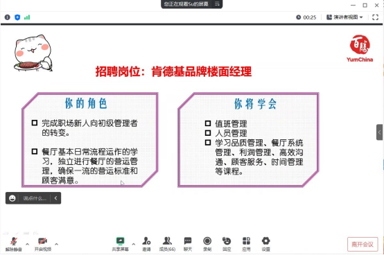 5月23日,tyc33455cc太阳成集团通过线上形式召开百胜中国控股有限公司专场招聘宣讲会。公司人力资源负责人郑小宁、公司党委副书记何江、食品科学与工程学系主任周艳、员工管理科副科长原琦、毕业班辅导员、2023届食品类相关专业毕业生参加。