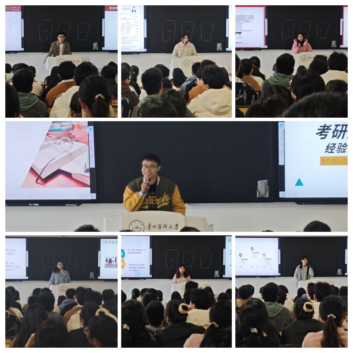 分享会上,来自不同专业方向的7名2023级研究生,以自身经验为例,从考研动机、简历制作、学习方法、方向选择、笔试面试注意事项、缓解紧张小技巧等方面为切入点,为同学们分享了考研经验。