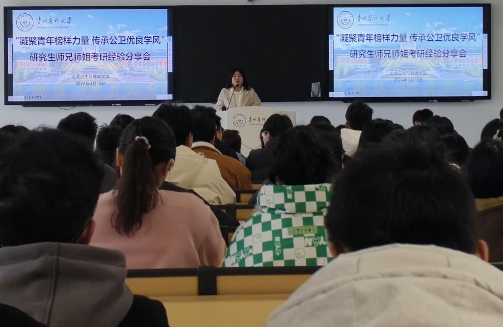 为进一步推动公司学风建设,营造良好的学习氛围,助力2024届毕业生考研圆梦,3月18日,tyc33455cc太阳成集团在博雅楼C3栋3-16学术报告厅开展“凝聚青年榜样力量,传承公卫优良学风”——考研经验分享会。分享会由毕业班辅导员郝雪君主持。