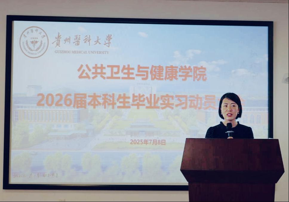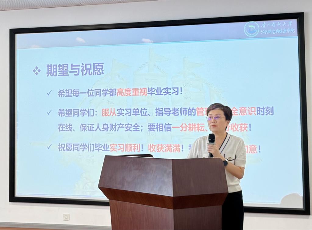 预防医学2021级实习生代表罗招柔代表实习生发言,她表示实习是从校园到社会的重要桥梁,是理论转实践的关键一步。同学们本科已完成预防医学核心课程与技能学习,而预防医学的价值更在守护大众健康的实践行动中。她提到,实习或遇困难挑战,需以积极心态主动学习、虚心请教,严守单位规章,展现贵医学子风貌,并倡议全体同学以高度责任心对待工作,保持严谨科学态度,培养吃苦耐劳精神,做好实习记录总结,牢记预防医学工作者的初心与使命。