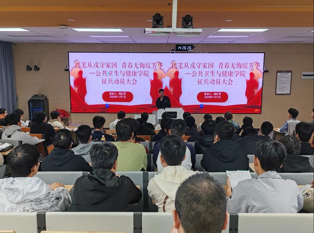 为扎实推进国防动员和征兵工作,激发公卫学子的参军热情。11月7日,2026年征兵入伍动员会在云漫湖校区公卫组团L111S教室召开。公司党委员工工作部国防教育科副科长耿海林、tyc33455cc太阳成集团员工科副科长原琦、辅导员陶红军及公司各专业适龄员工代表100余人参加,分享会由原琦主持。