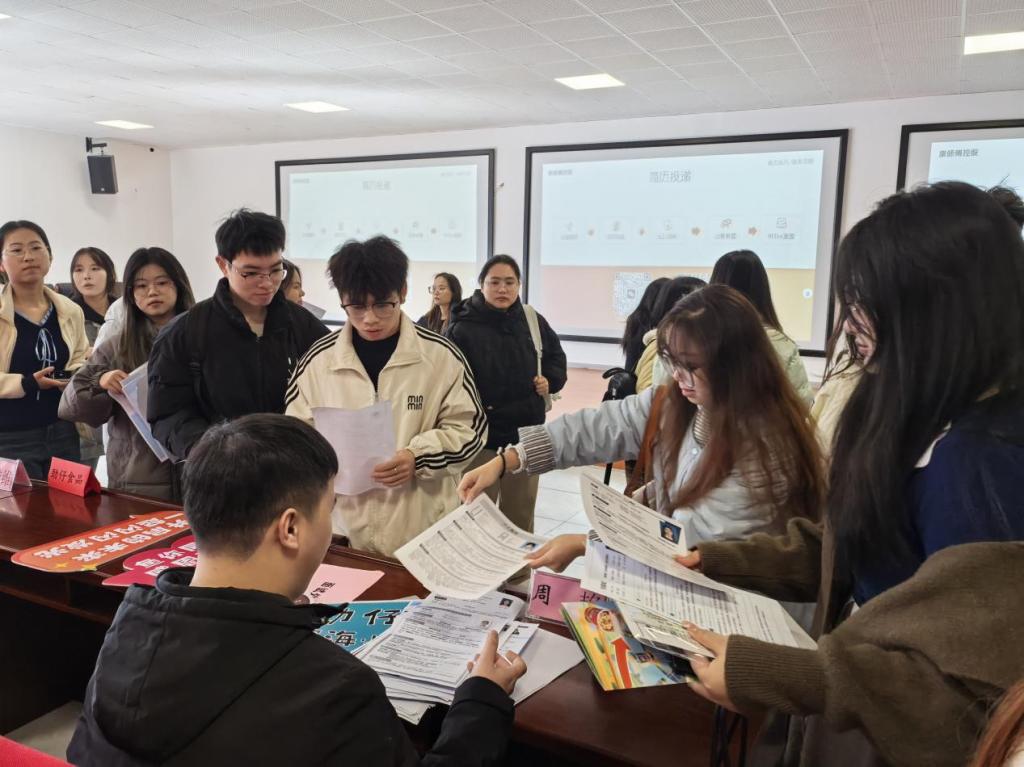 交流互动环节,同学们结合自身专业和职业规划,就岗位职责、任职要求、发展空间等关心的问题与企业代表进行了深入沟通,企业代表们也耐心细致地一一解答,现场气氛活跃。交流环节过后,现场招聘活动随即展开,两家企业设置了招聘咨询台,接收毕业生简历,并与有意向的同学进行了深入交流。