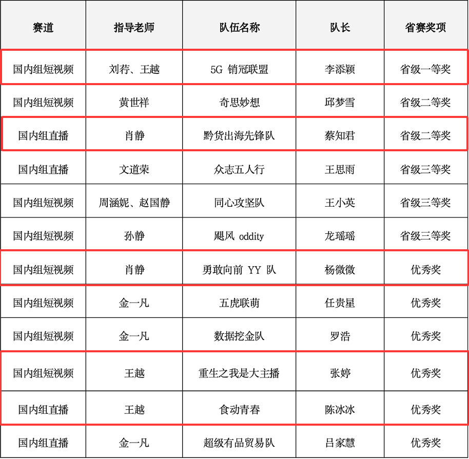 公司参赛队伍展现了强劲的实力与良好的精神风貌。在国内组短视频赛道中,由刘荇、王越老师指导,李添颖同学担任队长的“5G销冠联盟”队荣获省级一等奖;由肖静老师指导,杨微微同学担任队长的“勇敢向前YY队”,获省级优秀奖。由王越老师指导,张婷同学担任队长的“重生之我是大主播”队荣获省级优秀奖;在国内组直播赛道中,由肖静老师指导,蔡知君同学担任队长的“黔货出海先锋队”获省省级二等奖;由王越老师指导,陈冰冰同学担任队长的“食动青春”,获省级优秀奖。
