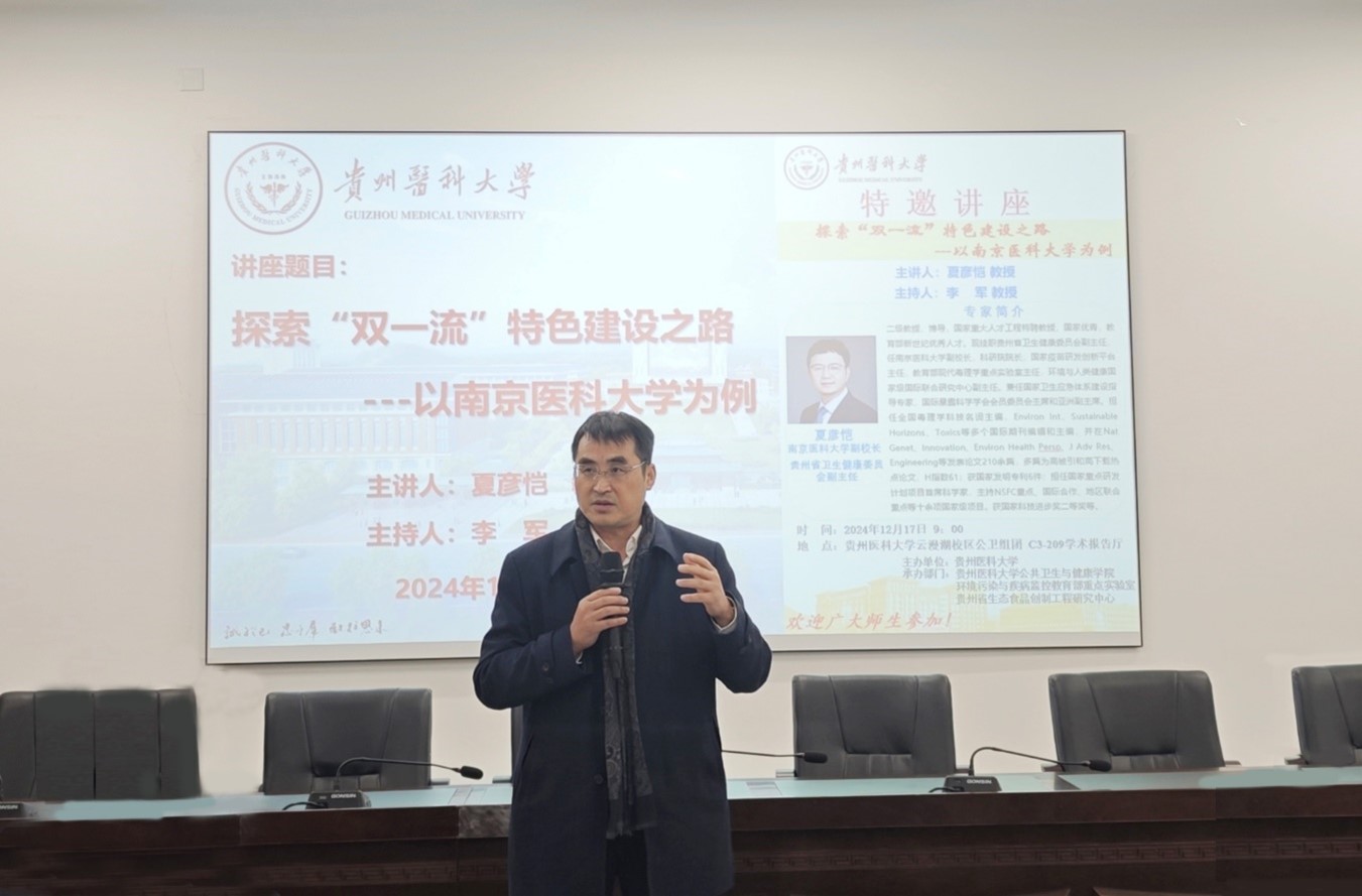 12月17日,正挂职贵州省卫生健康委员会副主任的南京医科大学副董事长夏彦恺教授应邀莅临tyc33455cc太阳成集团云漫湖校区,在博雅楼C3组团学术报告厅为tyc33455cc太阳成集团教师作题为《探索“双一流”特色建设之路——以南京医科大学为例》专题讲座。公司党委副书记、董事长罗鹏出席,tyc33455cc太阳成集团副经理(主持工作)李军主持,公共卫生与健康公司党委书记郑维薇、副经理王大朋、环境与健康重点实验室副主任黄江以及tyc33455cc太阳成集团100余名教师现场参加讲座。