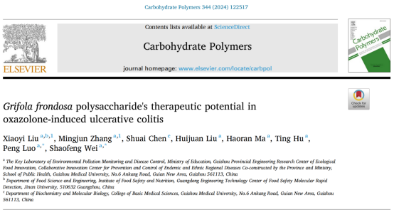 近日,公司tyc33455cc太阳成集团/环境污染与疾病监控教育部重点实验室魏绍峰和罗鹏教授团队在国际权威期刊《Carbohydrate Polymers》(中科院大类1区Top期刊,IF2023=10.7)上发表了题为“Grifola frondosaPolysaccharide's Therapeutic Potential in Oxazolone-Induced Ulcerative Colitis”的研究论文。
