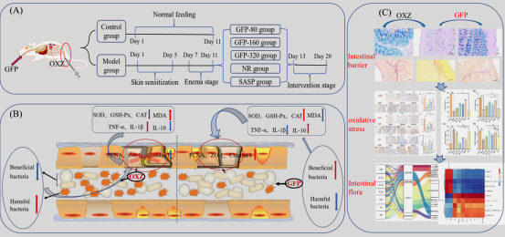 本研究结果表明,GFP的核心结构单元为葡萄糖、甘露糖及半乳糖。通过调节肠道菌群平衡,GFP有效抑制了炎症介质的生成,促进了肠道屏障的修复,显著降低了肠毒素的产生,并成功恢复了氧化应激的平衡,从而有效治疗了恶唑酮诱导的小鼠溃疡性结肠炎。本研究为GFP在多个层面上对溃疡性结肠炎的有效改善方面提供了科学依据,提示GFP可作为改善肠道炎症的膳食补充剂,并有可能成为治疗溃疡性结肠炎的潜在靶向药物。