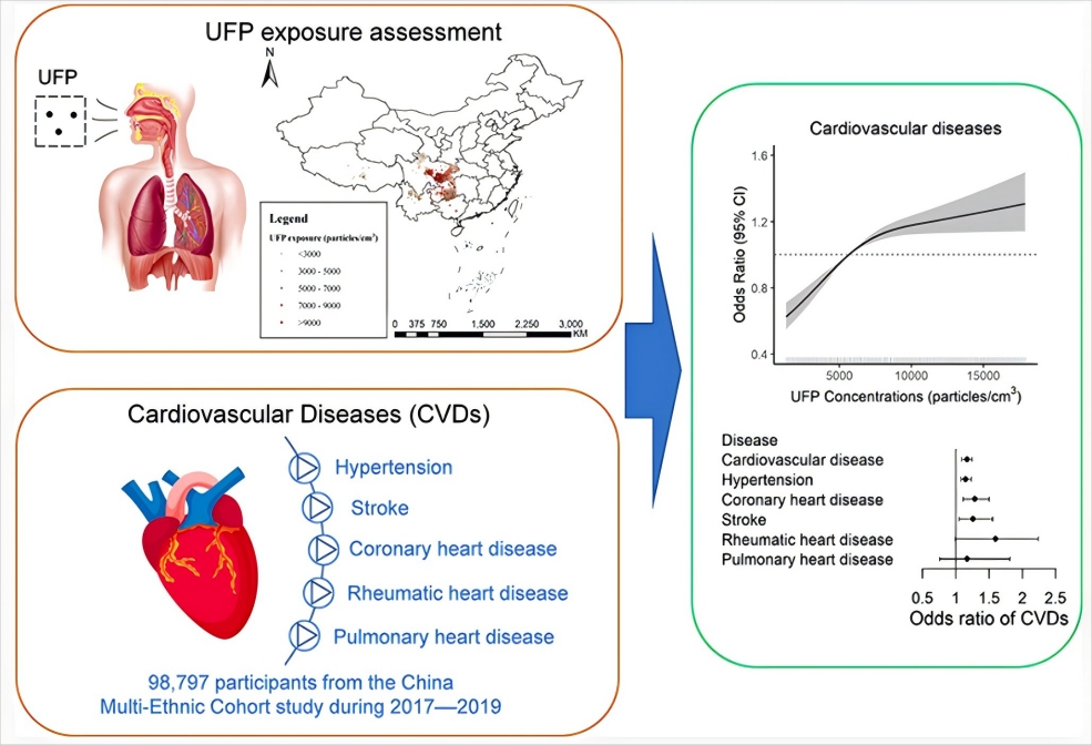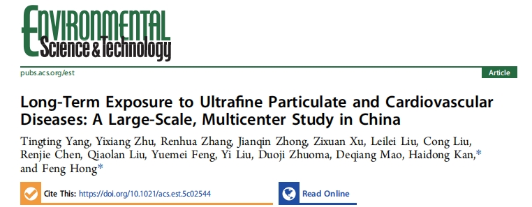 近日,洪峰教授团队联合复旦大学阚海东教授团队,在环境科学领域顶级期刊《Environmental Science & Technology》(中科院一区TOP期刊,影响因子11.3)发表题为《Long-Term Exposure to Ultrafine Particulate and Cardiovascular Diseases: A Large-Scale, Multicenter Study in China》的研究论文,研究以中国西南地区5个省(自治区)的近10万名参与者数据结合高分辨率大气化学模型,首次系统探讨了中国人群长期暴露于超细颗粒物(UFP)与心血管疾病(Cardiovascular Diseases, CVDs)患病率之间的关联。