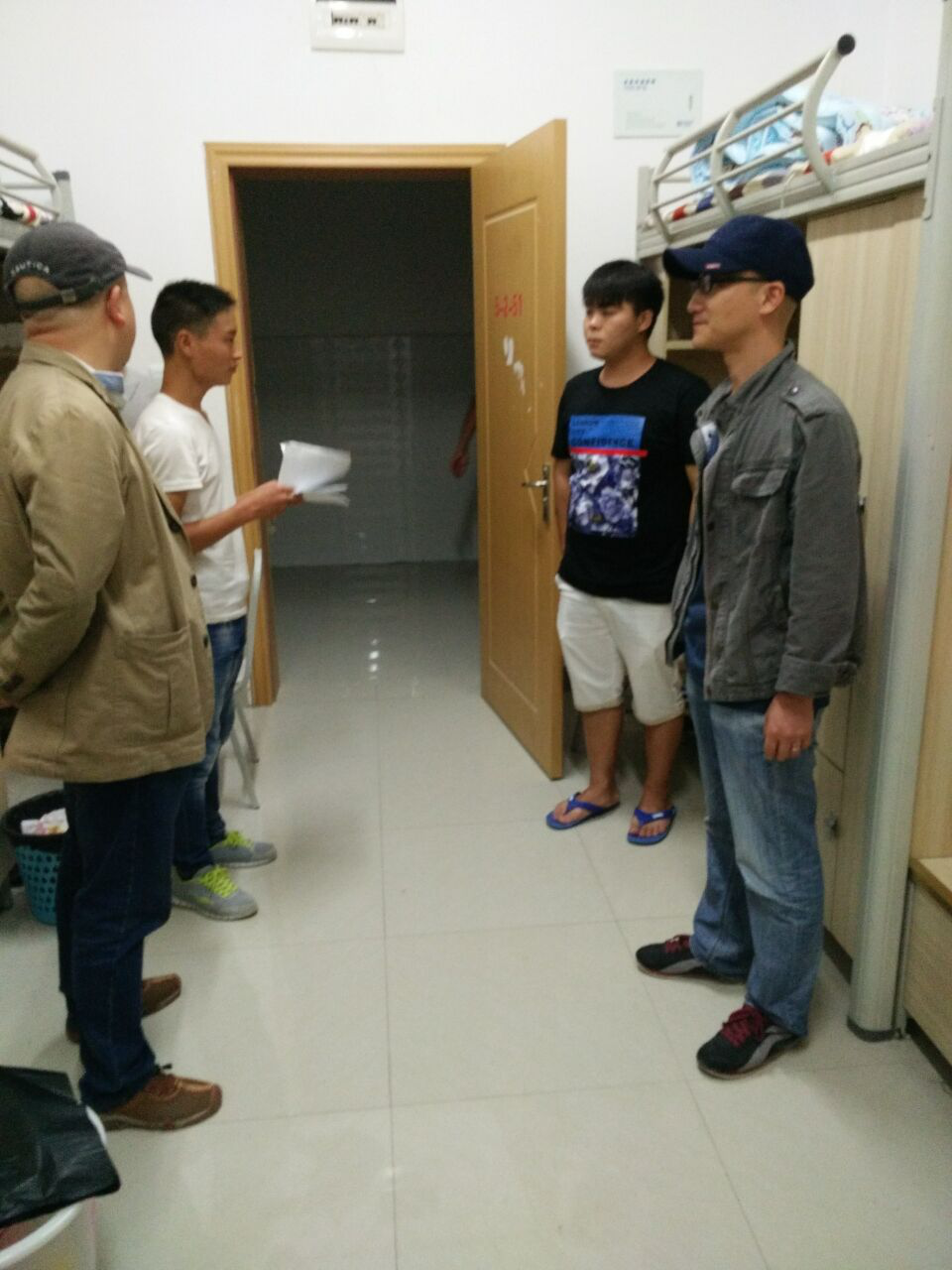 8月28日晚上9点,公共卫生公司经理洪峰、党委副书记何江、辅导员孙静和员工干部一行前往公共卫生公司2016级新生宿舍走访,了解新生们的入校适应情况和第二天上课的准备情况。
