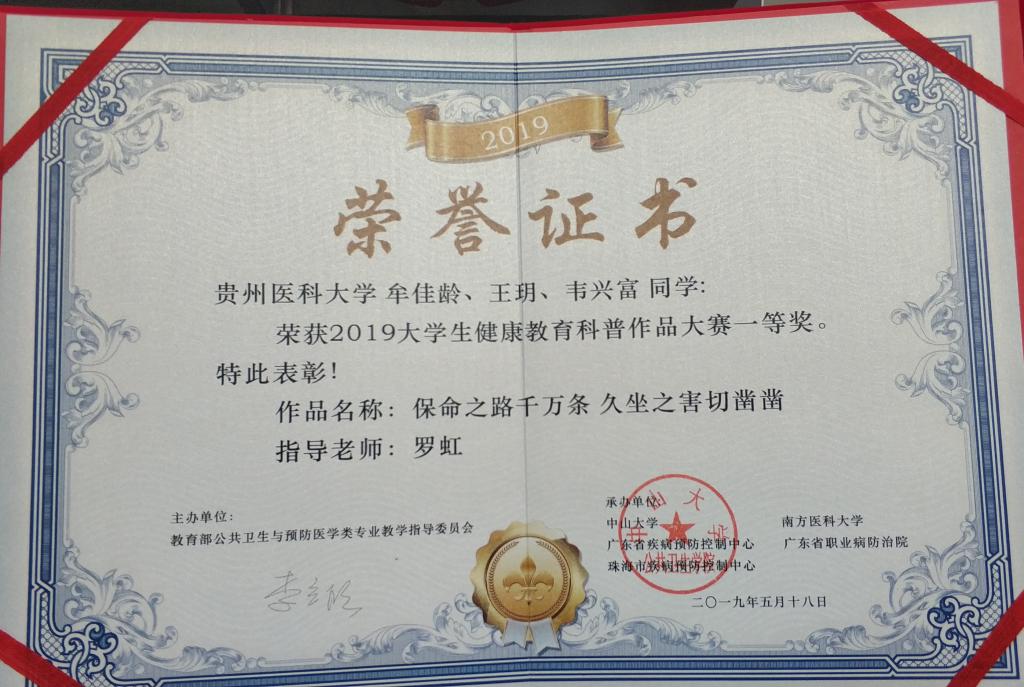 近日,由教育部公共卫生与预防医学类专业教育指导委员会主办,教育部公共卫生与预防医学类专业教学指导委员会主办,中山大学、南方医科大学、广东省疾病预防控制中心和广东省职业病防治院承办了“2019老员工健康教育科普作品大赛”评选结果揭晓,公司公共卫生公司选送的2件员工创作作品在大赛中取得佳绩。由罗虹老师指导,牟佳龄、王玥、韦兴富同学创作的作品《保命之路千万条久坐之害切凿凿》获一等奖;李军老师指导,陈丽、彭婷、林秀宪同学创作的作品《保护视力从我做起》获二等奖。