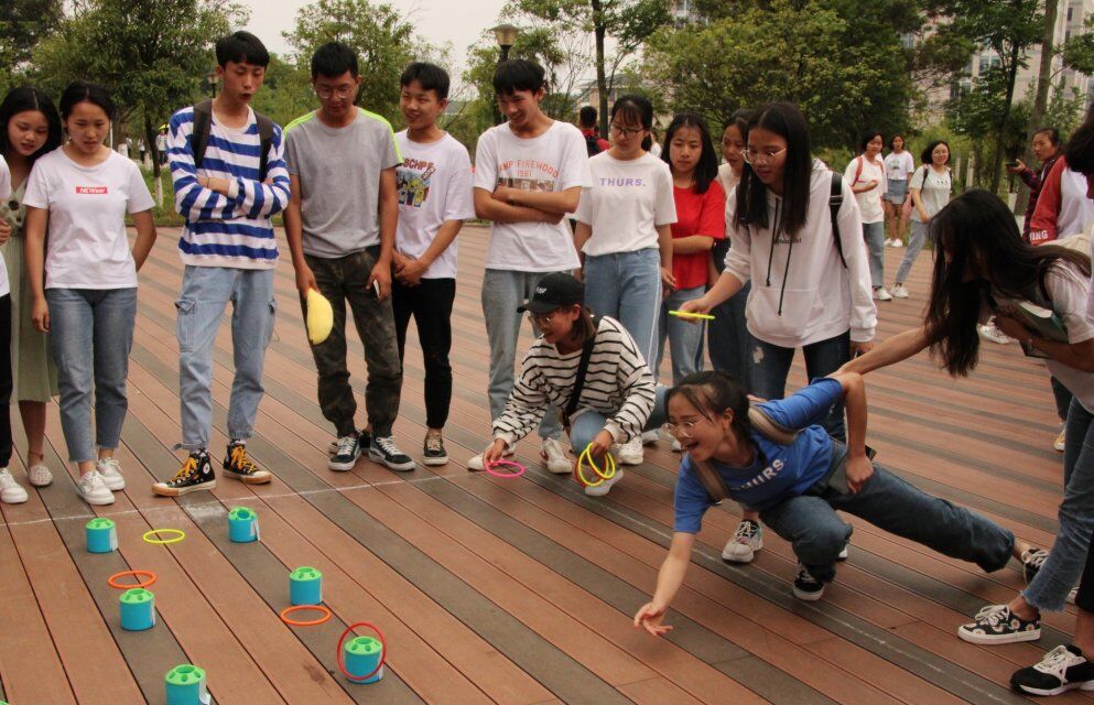 在“掷圈套公仔”活动中,同学们通过集赞数或现场踢毽子赢取投掷圈,在规定范围内投掷套取笔筒,套中特别标记的笔筒即可赢得公仔玩具一个。活动场地更被围得水泄不通,烈日炎炎不能阻挡同学们的热情,获得公仔的同学又蹦又跳,身边的同学们亦投来羡慕的眼光。