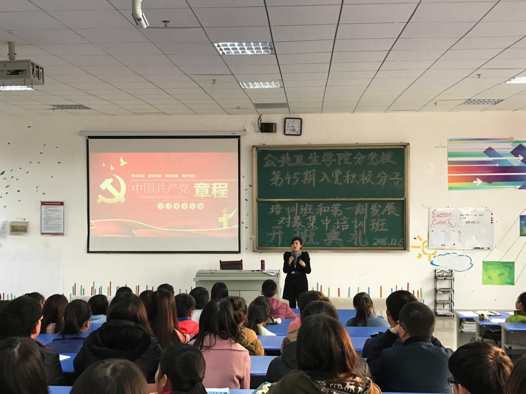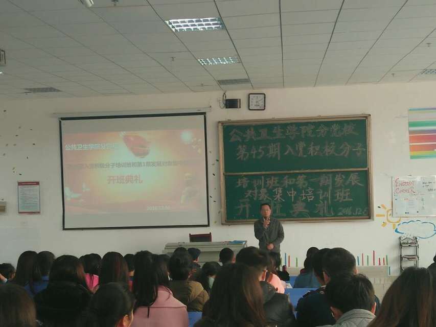 12月5日(周一)下午4点10分,公共卫生公司分党校第45期入党积极分子培训班和第1期发展对象集中培训班开班典礼在公司南校区x1501教室举行。 公司党委组织部部长李兴,公共卫生公司党委书记杨光红,公共卫生公司党委副书记何江,员工第二党支部书记孙静,分团委负责人柴颖出席了本次开班典礼。公司139名入党积极分子及28名发展对象参加开班典礼。开班典礼由孙静主持。