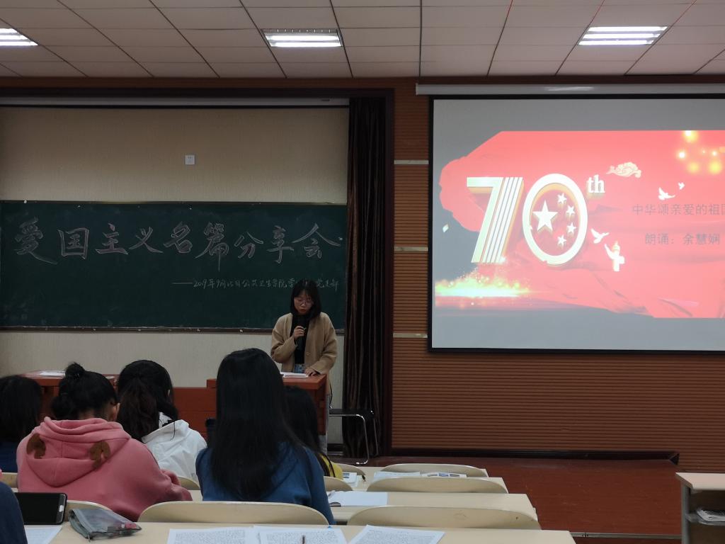 为庆祝新中国成立70周年,将爱国主义教育、理想信念教育融入“不忘初心、牢记使命”主题教育,9月25日公共卫生公司员工第一党支部在博雅楼一楼阶梯教室开展“不忘初心、牢记使命”主题教育之爱国主义名篇分享会。参加本次分享会的有公共卫生公司员工第一党支部的党员、发展对象、入党积极分子共40余名。